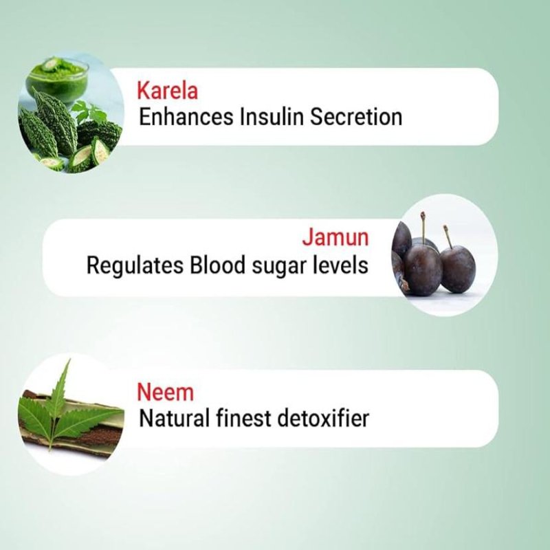 Description- An Ayurvedic Proprietary Medicine Help in High Blood Sugar Composition: Each 10ml contains ext. of: Mormordica charantia (Karela) Fr.   750 mg Eugenia jambolana (Jamun) Sd.        750 mg Azadirachta indica (Neom) Lf. & Fr.  10 mg Direction for Use: Adults: 15-30 ml. twice daily with 100ml water Children: 5-10 ml. twice daily or as directed by your Healthcae Professional Due to natural ingredients the colour taste consistency may vary Some sediments are a natural occurrence. WARNING: Consult your Healthcare Professional if you have any medical condition, or if you are taking any medication, De not take this product ifyou are pregnantor nursing. Due to natural ingredients the color, Taste and consistency may very नीम- - रक्तसोधन का काम करता है - ⁠चर्म रोग में विशेष लाभकारी है - ⁠दाँतो और मसूड़ो को मजबूत करने में काम करता है - ⁠कील मुहांसे , फोड़े फुंसी में अत्यंत लाभकारी है - ⁠रक्त में शुगर की मात्र को नियंत्रित करता है ⁠करेला -   - करेला ब्लड सुगर और ग्लूकोसुरिया के लेवल को कम करने में लाभकर है - ⁠करेला पैंक्रियास की क्रिया की उत्तेजित कर इन्सुलिन के निर्माण में सहायता करता है - ⁠रक्त शोधक , वायुविकार , अपचन , गैस और कफ में लाभकर है और रोगप्रतिरोधक क्षमता बढ़ाता है - ⁠करेला रक्त में कोलेस्ट्रॉल की मात्र को नियंत्रित करने में मदद करता है - ⁠कील मुहांसे और चेहरे पर दाग धबो कम करने में लाभकारी है जामुन -       - मधुमेह और चर्म रोग में लाभकारी है - ⁠पाचन क्रिया को ठीक करने में सहायक है - ⁠मूत्र विकारों में लाभकारी है - ⁠दांत और मसूड़ों को मजबूत रखने में सहायक है - ⁠मुंह के छालों में लाभदायक है
