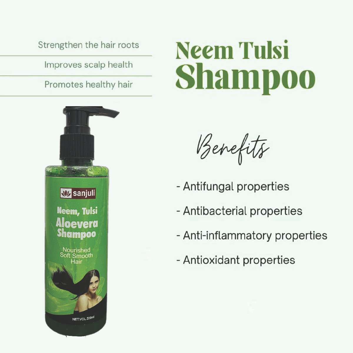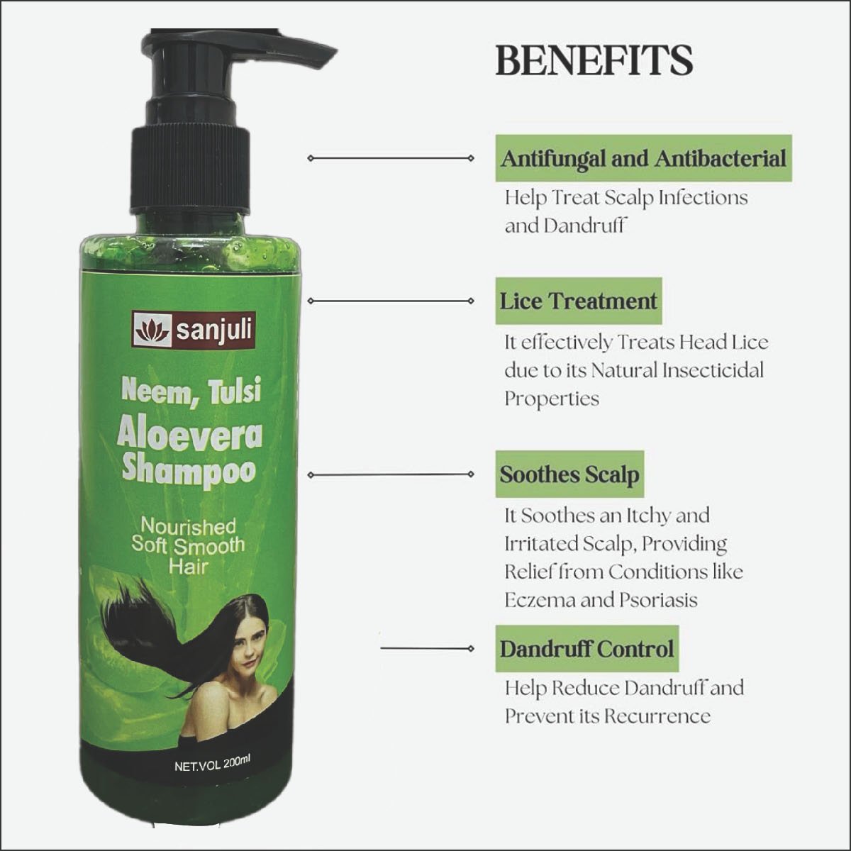 Description- Anti Dandruff and Nourished Soft Smooth Hair INGREDIENTS: Neem, Tulsi ,Aloevera ext, Tumeric ext, Ritha exl., Jojoba ext, Amla ext, Rose water, Aqua, Sles, coco, Betaine, Glycercine, wt, E,E218 etc BENEFITS: Removes excess oil & Pollution, Controls hair fall, Dandruff, roughness, provides conditioning nourishment & makes hair smooth. DIRECTION FOR USE: Use appropriate amount of shampoo and apply it throughly into wet hair. Keep it for sometime then rinse throughly with clean water. FOR EXTERNAL USE ONLY STORE IN COOL & DRY PLACE
