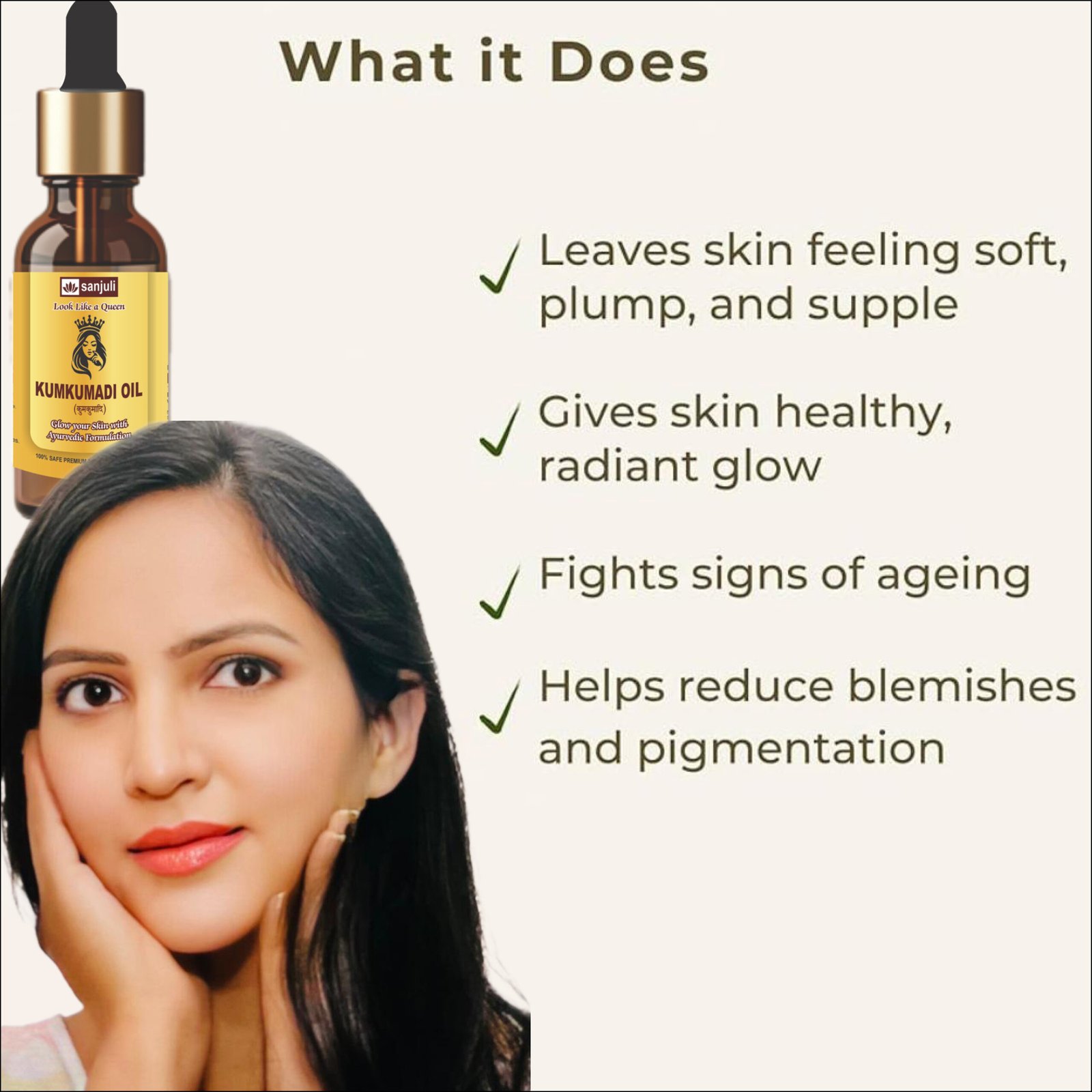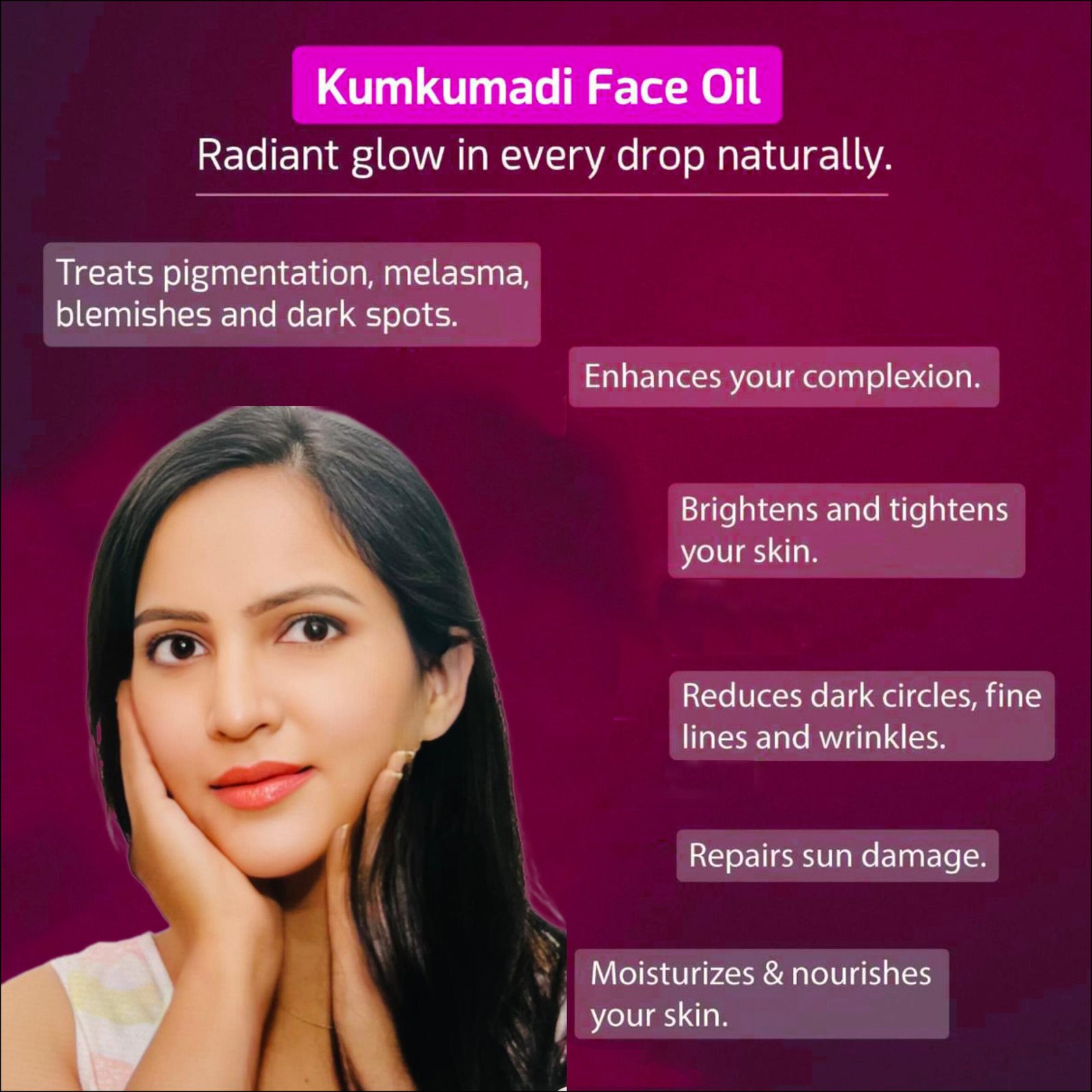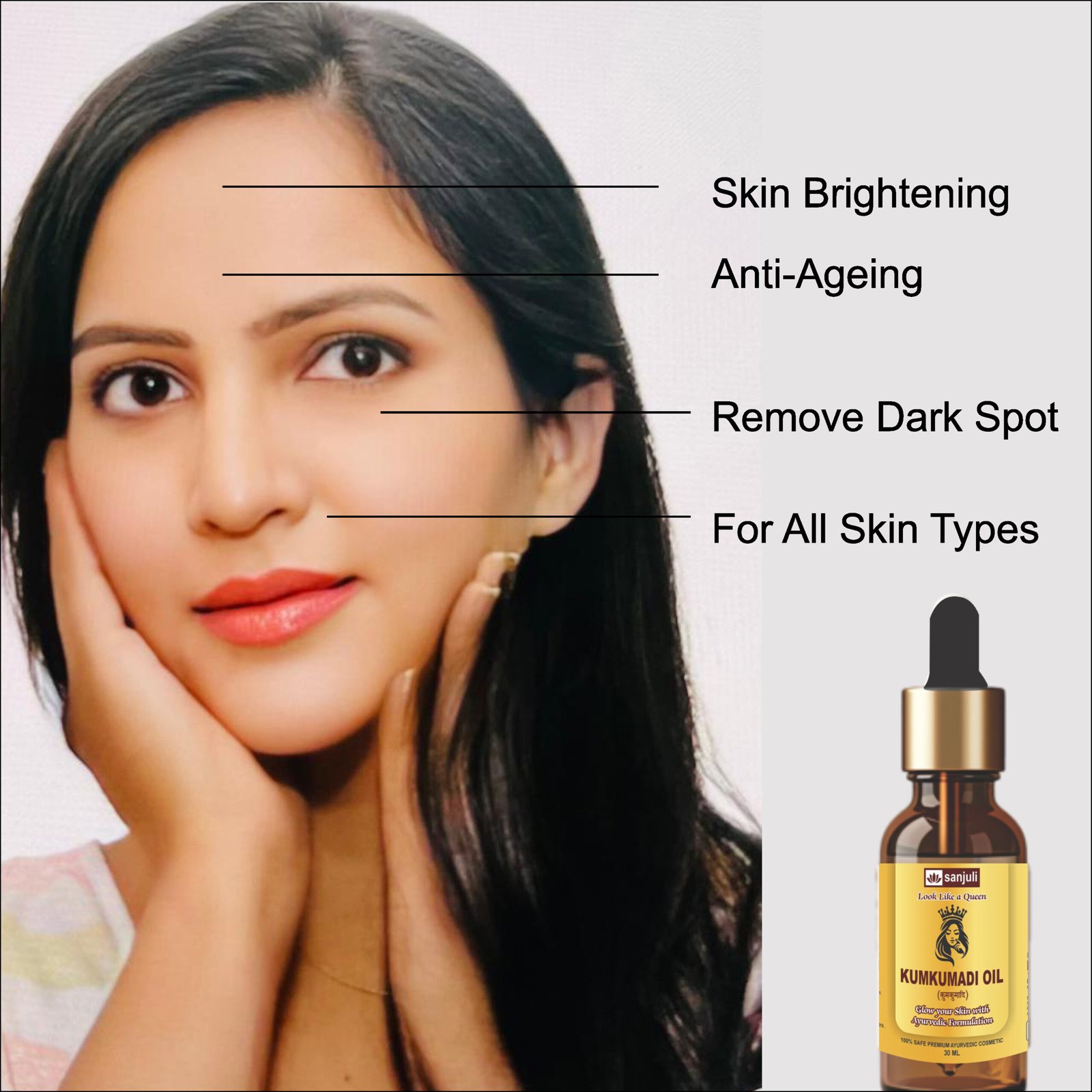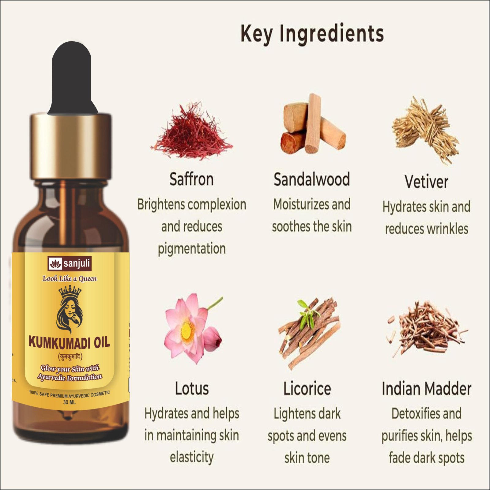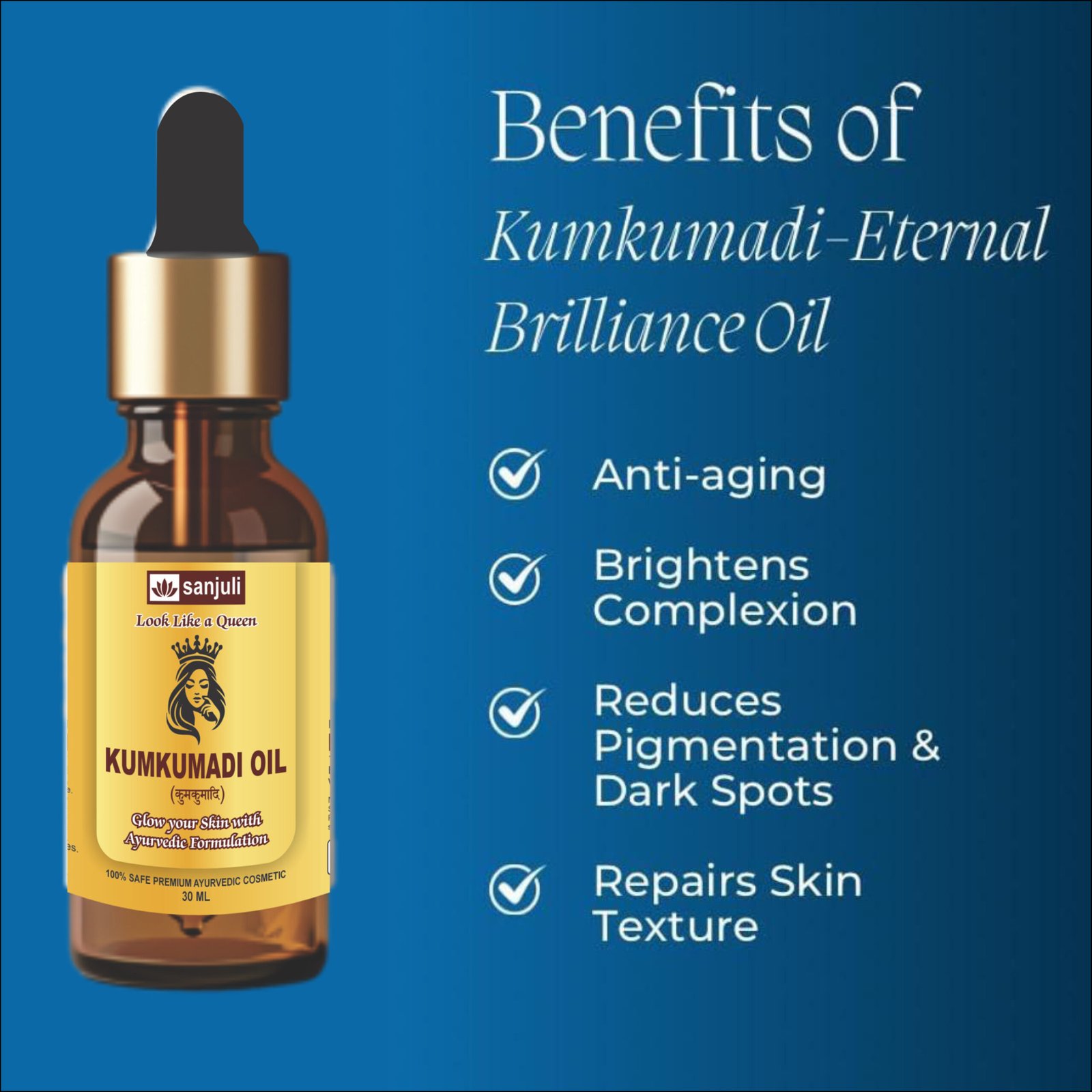 -Kumkumadi Oil is a luxurious Ayurvedic blend known for its ability to brighten the skin, reduce dark spots and pigmentation and enhance natural radiance.
