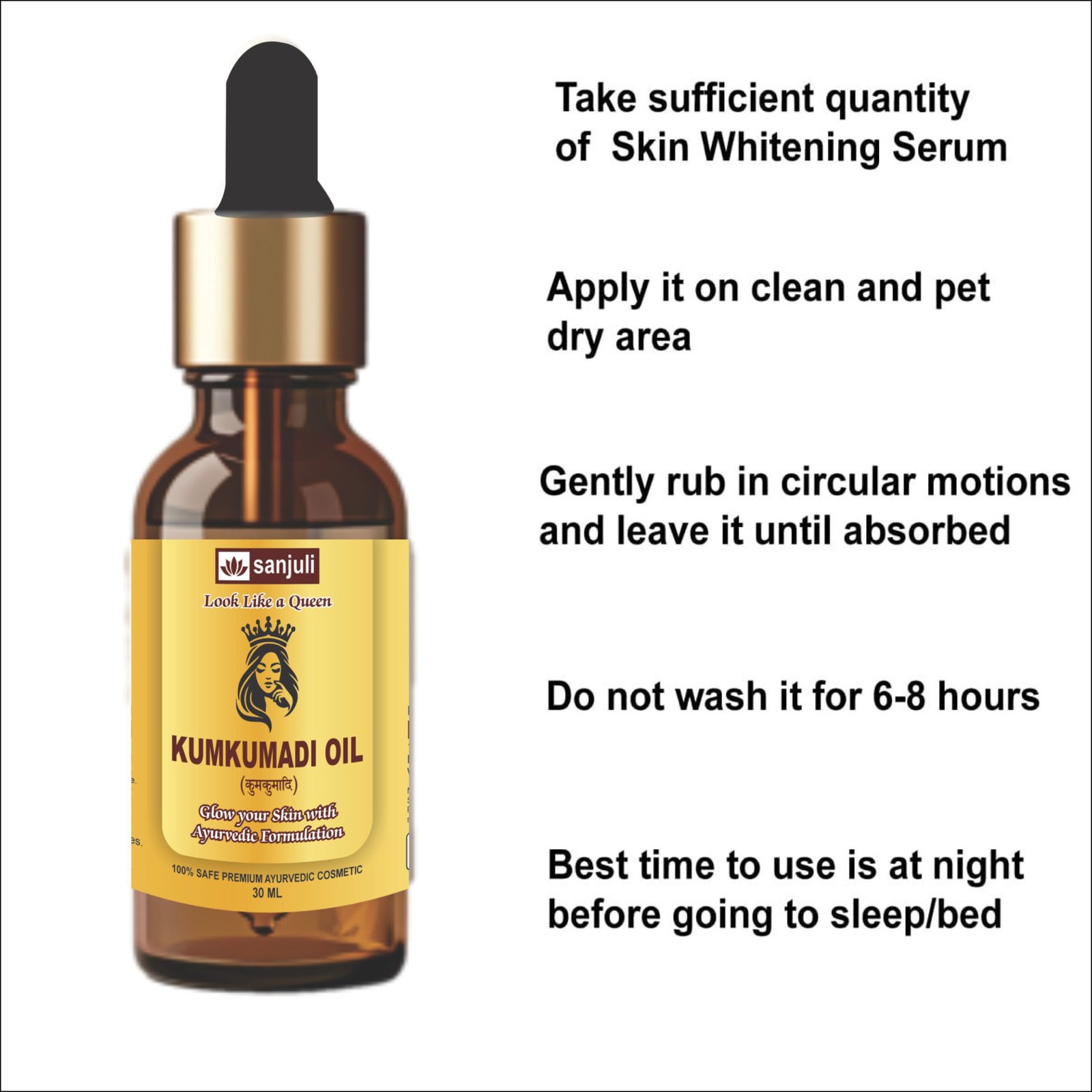 -Take 2-3 drops of Kumkumadi Oil and apply evenly to the face and neck. Gently massage in upward circular motions until fully absorbed. Use at night for best results. Suitable for daily use.